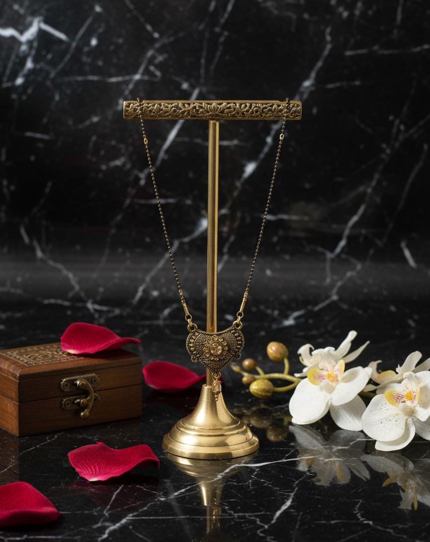 Elevate your bridal or everyday look with this stunning traditional gold-toned mangalsutra. The necklace features a beautifully crafted ethnic pendant with intricate detailing, centered with a sparkling stone. A delicate dangle bead adds a touch of grace to the design. The classic black bead chain is a staple of Indian jewelry and symbolizes marital devotion. This piece is perfect for both traditional events and daily wear, offering a blend of cultural heritage and contemporary style. It’s an ideal accessory for brides, newlyweds, or anyone who appreciates elegant, ethnic jewelry.